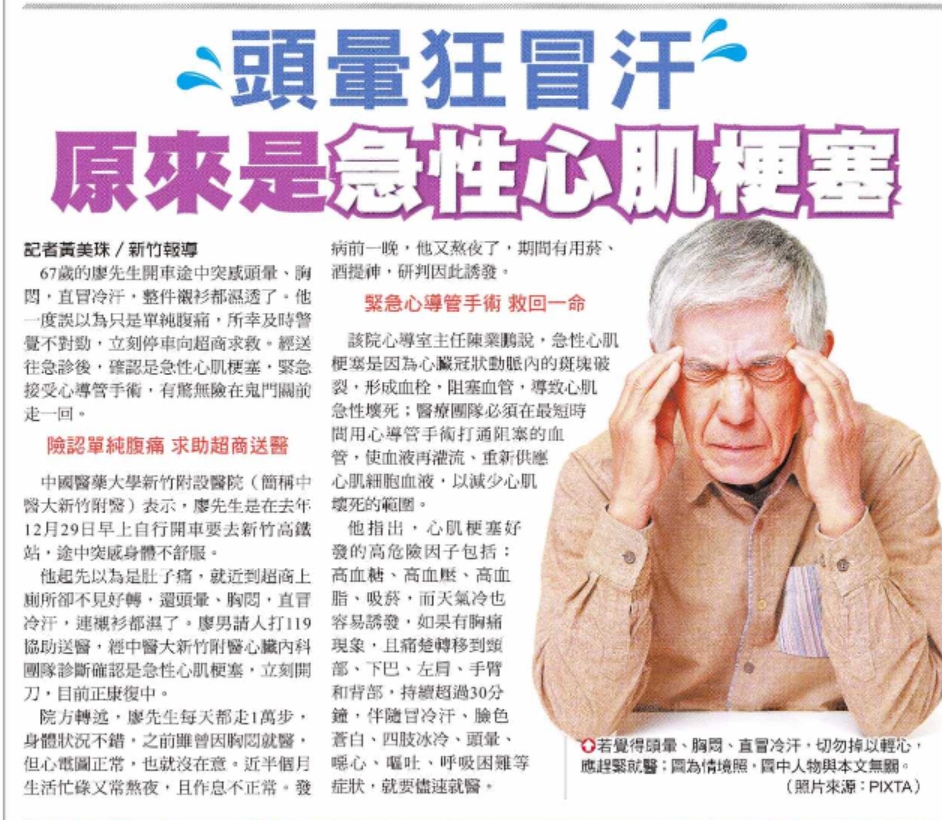 這名67歲廖姓男子已退休,上週六(12/29)上午開車到位於竹北的新竹高鐵站,途經文興路時突然感覺不適,他起初以為是腹痛,就近停車到超商借用洗手間,但如廁後仍未見好轉,不但頭暈胸悶,且冷汗直冒,身上的襯衫都溼透了。他趕緊請一旁的國中生協助打119,緊急送至中醫大新竹附醫,心臟內科團隊從心電圖發現是心肌梗塞,緊急手術搶救。