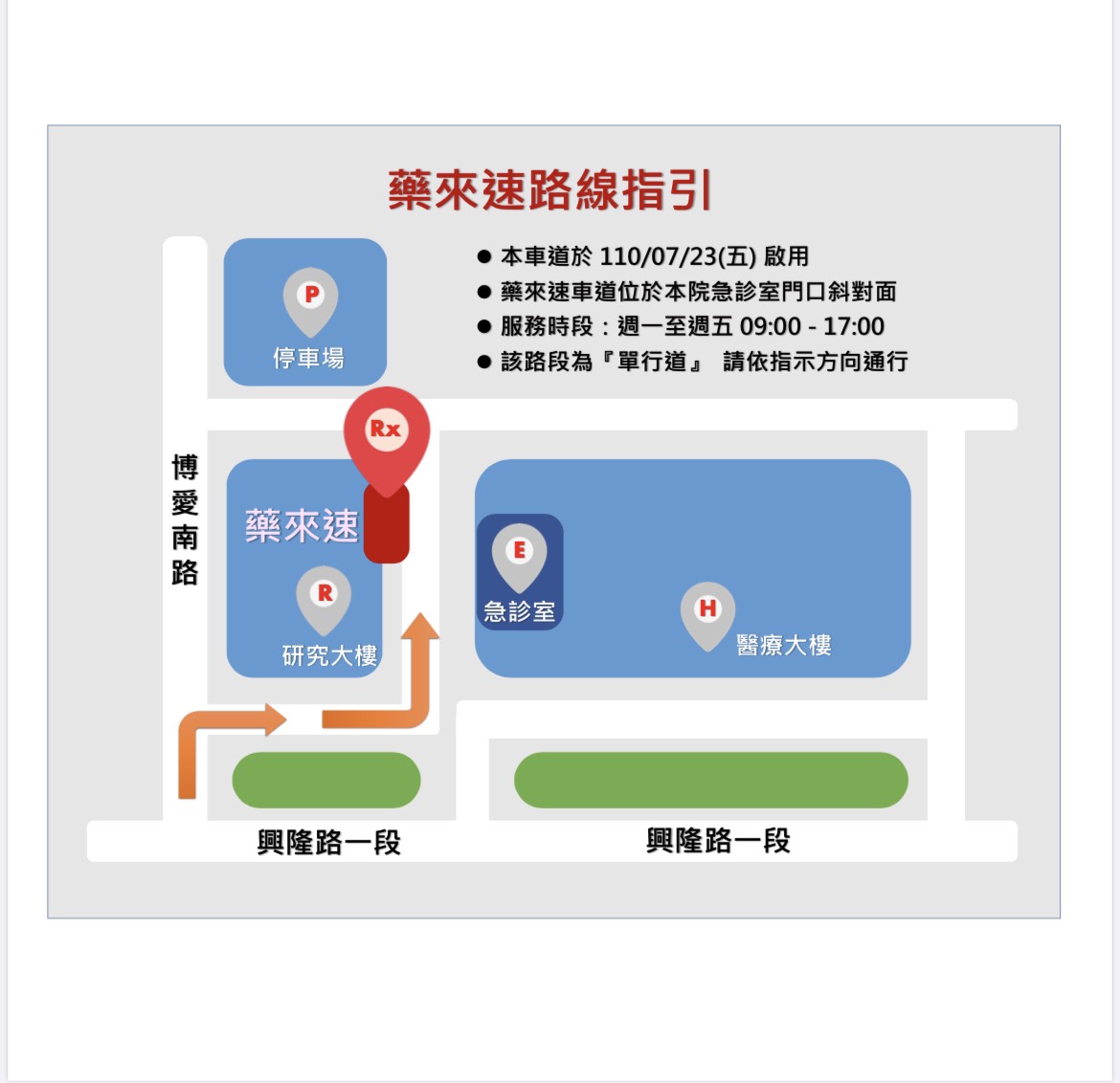 『疫情期間戶外預約領藥說明』 :因防疫所需,連續處方箋預約領藥自110年7月23日起,請於 醫療棟 急診室 對面 『藥來速車道』領藥。